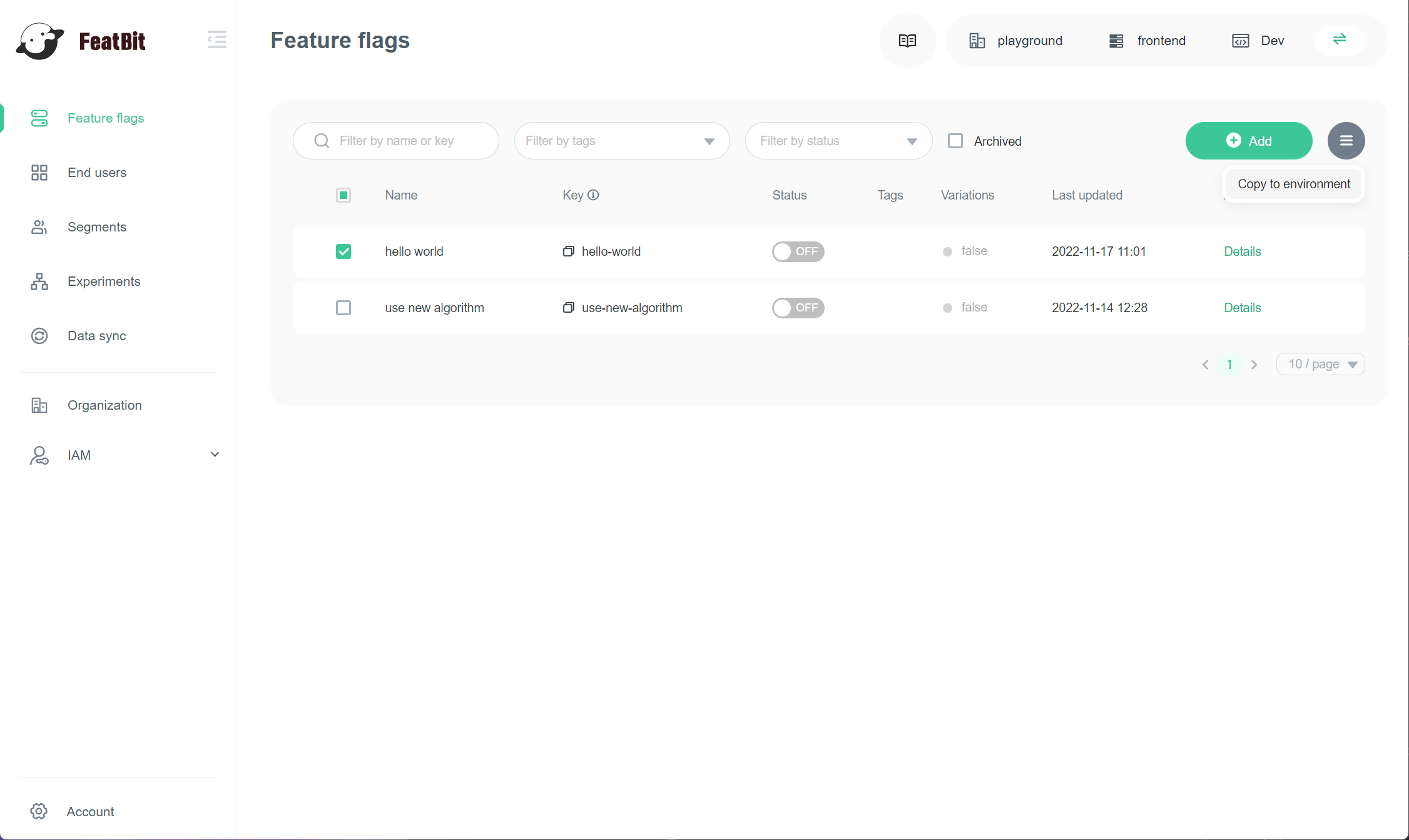 This topic explains how to use the feature flags list, which shows your feature flags and gives you options to create, modify, and manage them.