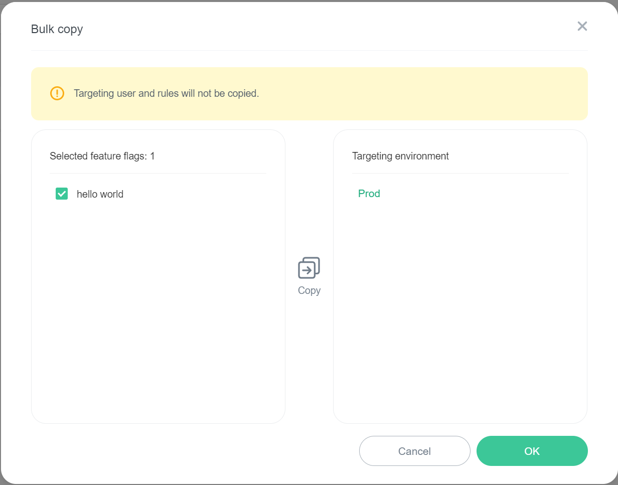 - Check the selected flags again and choose the targeting environment which flags will be copied to.