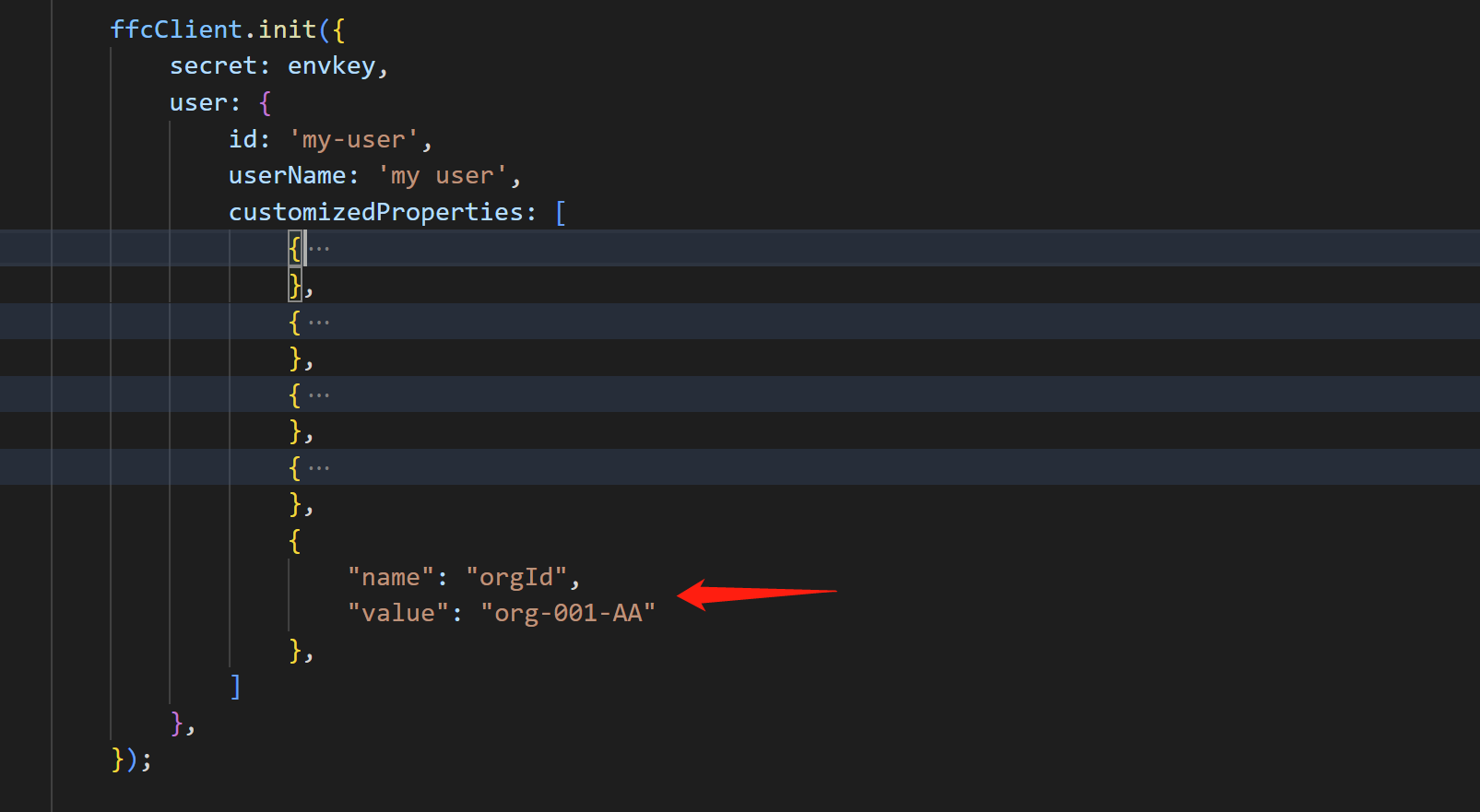 Be sure that the property "orgId" and the value have been passed to FeatBit system when initializing SDK. Be sure that the key you set in preset values (image above) is as same as what you passed in the code of SDK initiliazing.