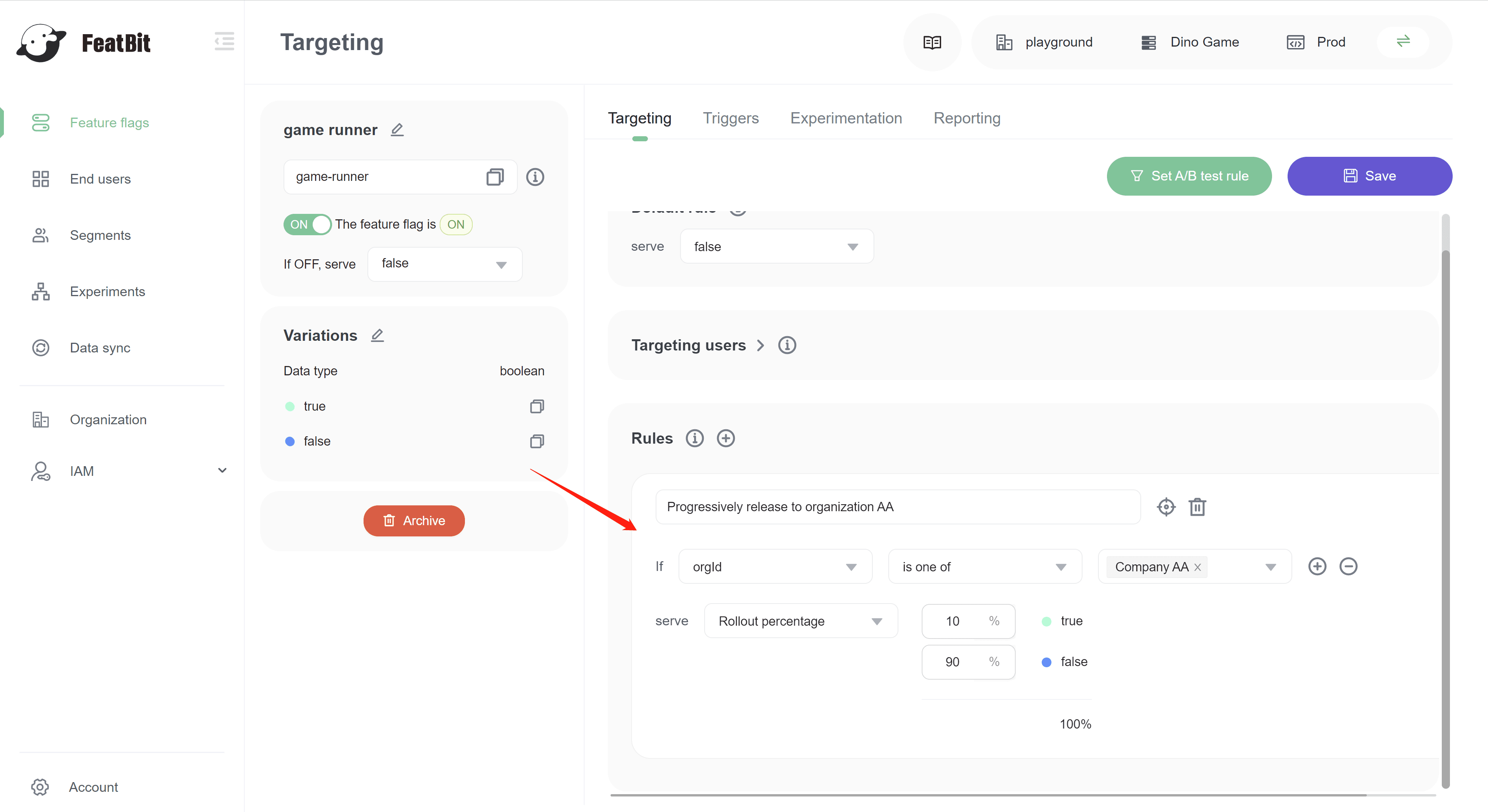 Go back to "game runner" feature flag's "Targeting" page. Create a rule with the property "orgId" you just created. You need to: