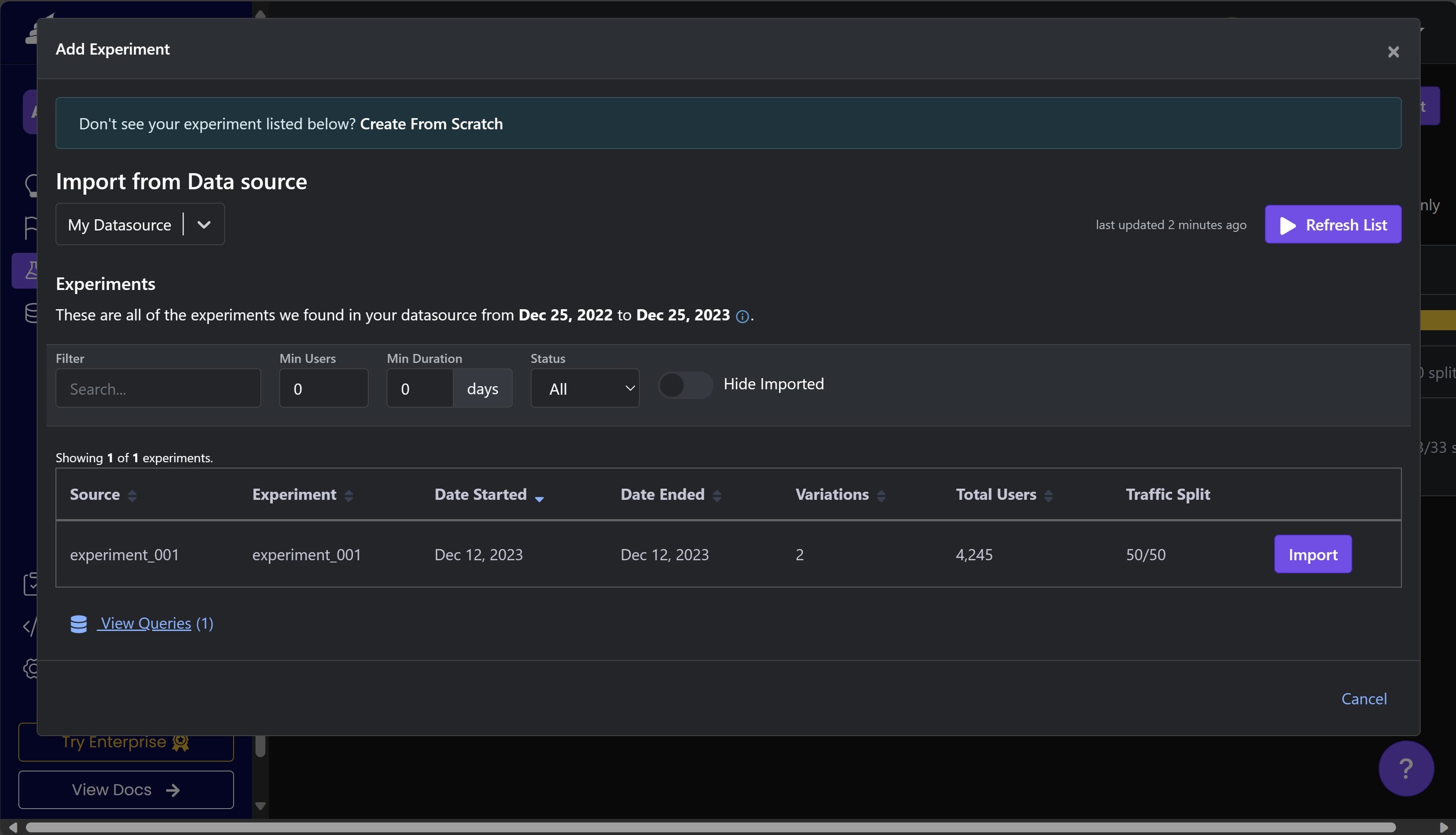 Select the Data Source you created earlier. Growthbook will then automatically load the experiment assignment queries and metrics you have previously set up. Click the Import button.
