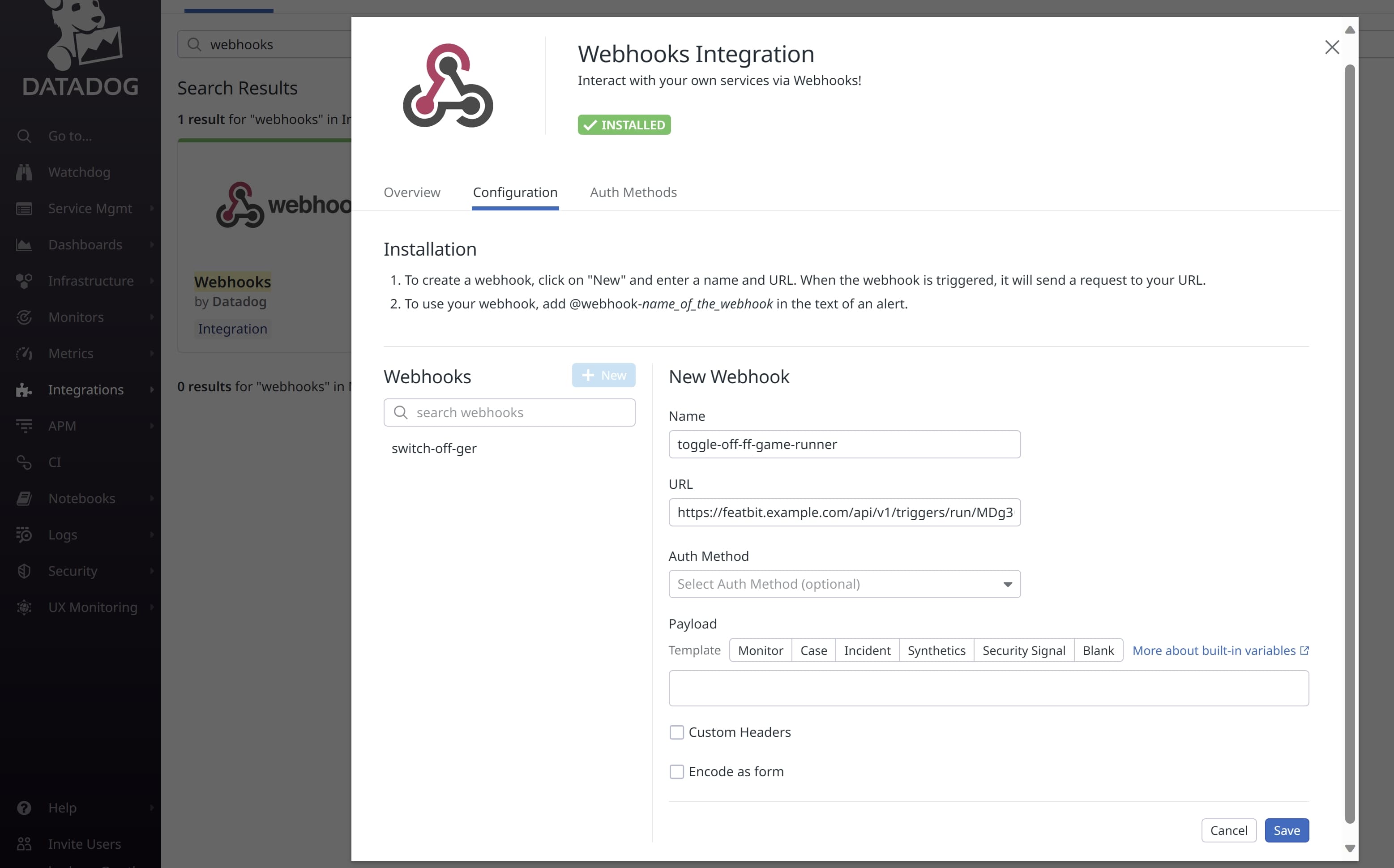 Setting up WebHook for DataDog events integration