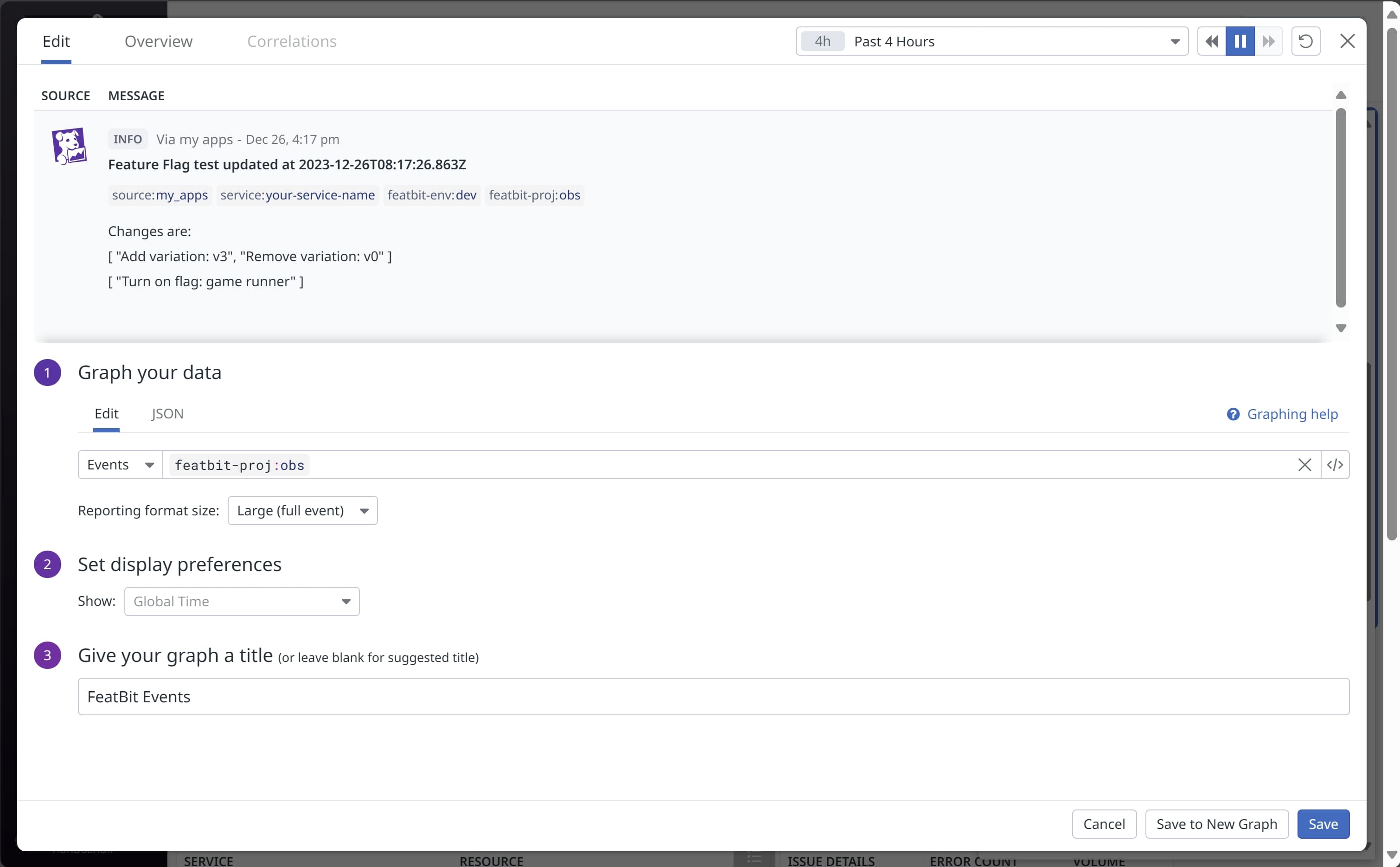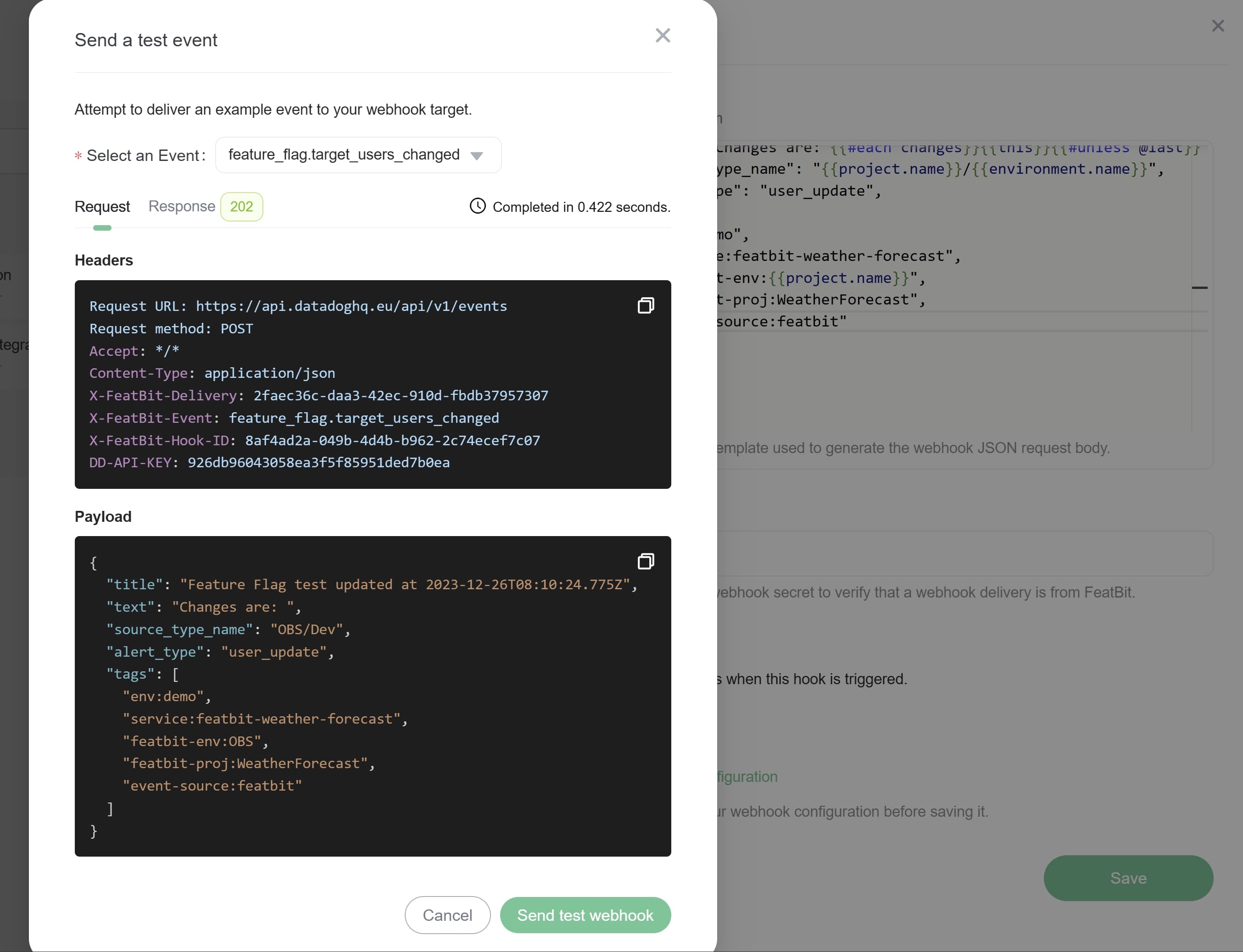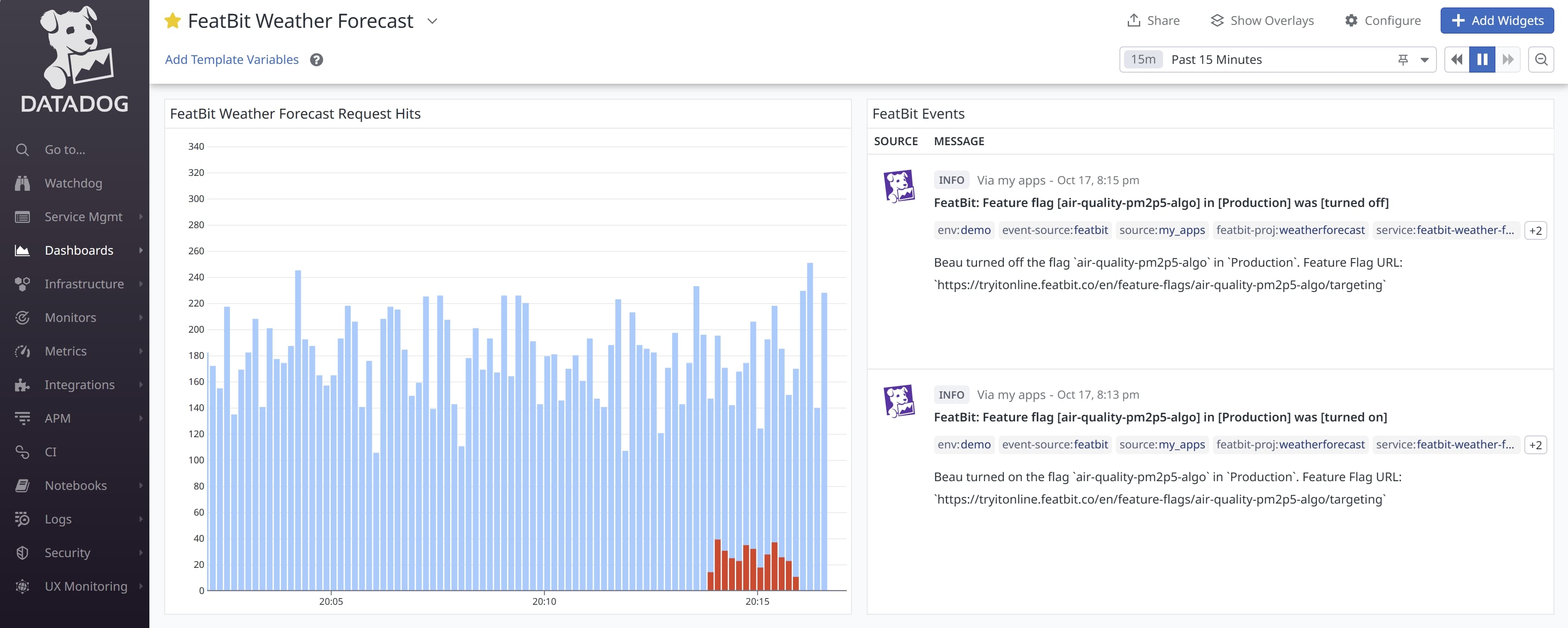 2. Using the Datadog events integration (opens in a new tab) to receive activities from FeatBit such as Feature Flags updates.
