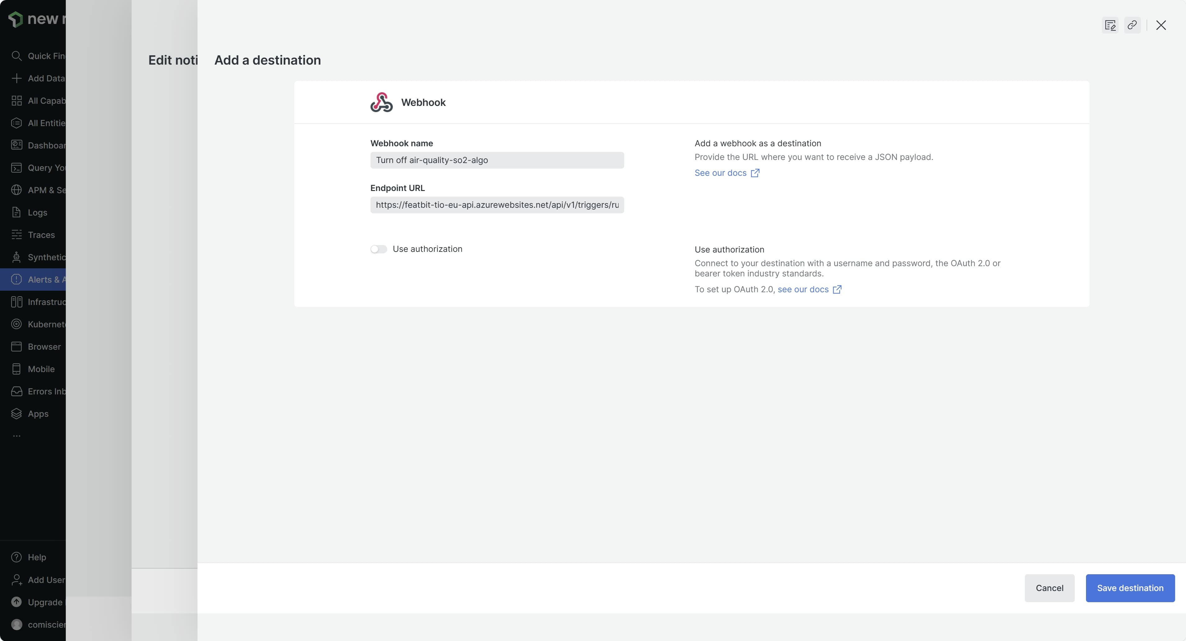 4. Enter the URL of the New Relic One Deployment Event API. You can find the API URL in the official tutorialofficial tutorial (opens in a new tab).